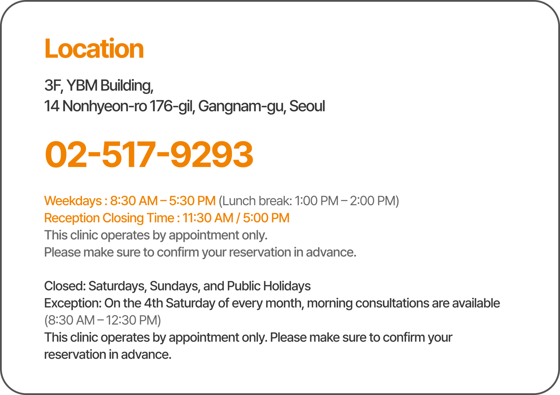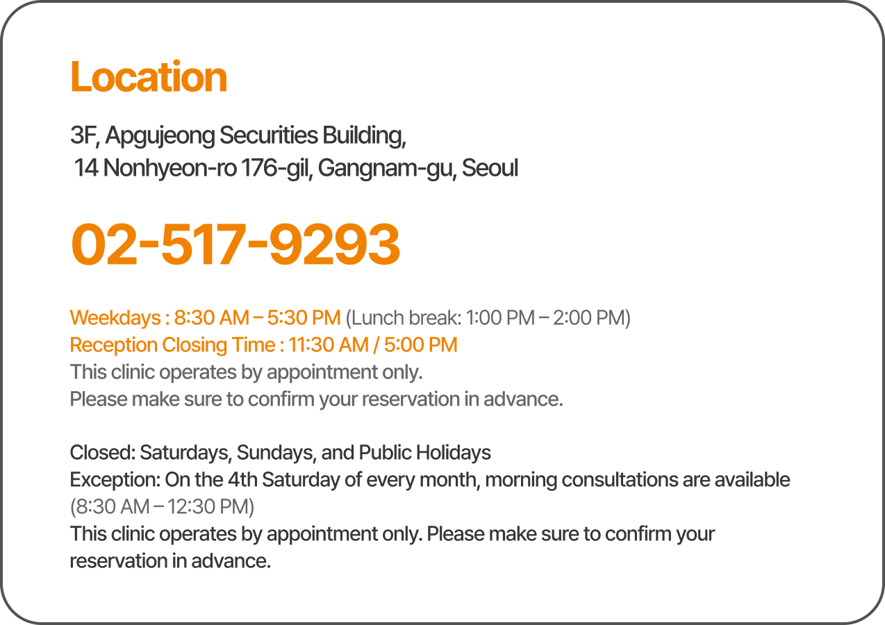 Adr : 3F, Suite 301, 14 Nonhyeon-ro 176-gil, Gangnam-gu, Seoul